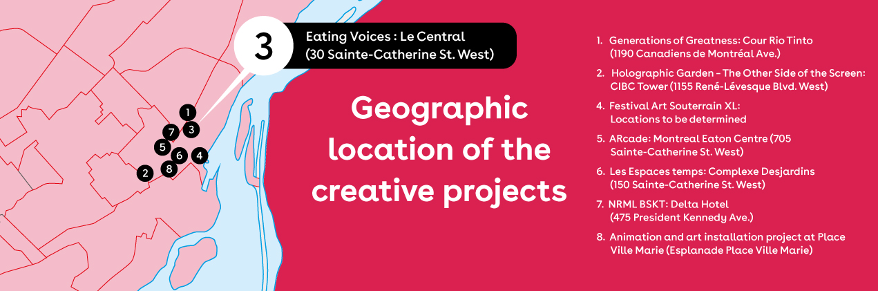 Located in Le Central, a hub for local gastronomy icons and emerging restaurateurs, the project invites guests to awaken their senses by savouring a meal to the sound of audio stories developed by local artists. Drawing on their respective practices and approaches, writers, filmmakers, playwrights, visual artists, dancers and perfumers have developed audio stories that strike the imagination and create unique and deep connections between people.