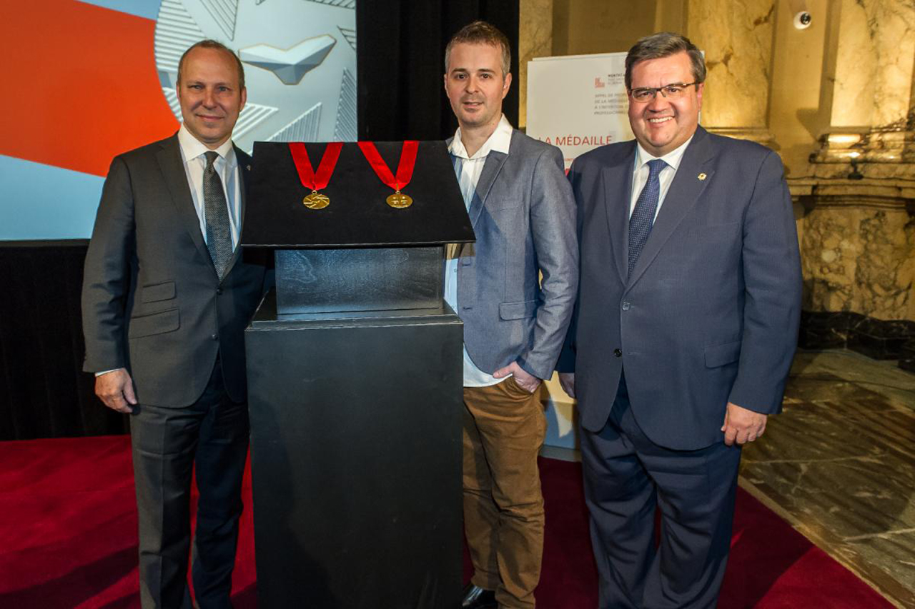 Michel Leblanc, président et chef de la direction de la Chambre de commerce du Montréal métropolitain, Jacques Desbiens, designer industriel, et Denis Coderre, maire de Montréal, lors du dévoilement de la médaille de l’Ordre de Montréal